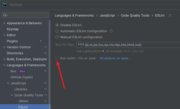 Auto fix eslint when saveAuto fix ESLintGo to Languages & Frameworks > JavaScript > Code Quality Tools > EslintCtrl+Alt+sCheck Run eslint --fix on save22 May 2025Search everywhere add database tag